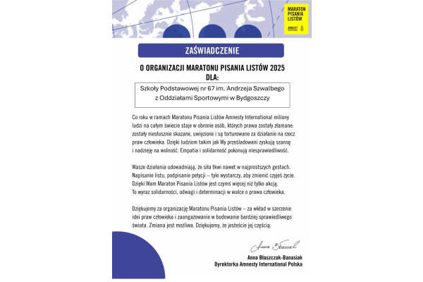 Nasza szkoła otrzymała zaświadczenie od Amnesty International za organizację akcji Maraton Pisania Listów 2025 o charakterze globalnym .