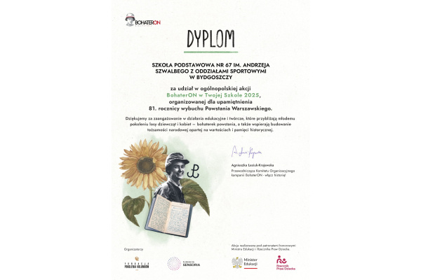 Nasza szkoła otrzymała dyplom za udział w ogólnopolskiej akcji „BohaterON w Twojej Szkole 2025”, organizowanej dla upamiętnienia 81. rocznicy wybuchu Powstania Warszawskiego.