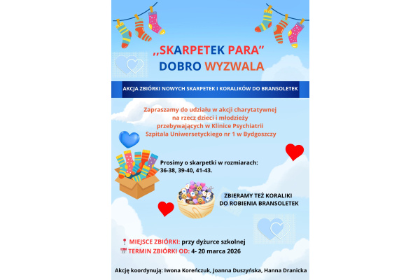 Skarpetek para dobro wyzwala - zapraszamy do akcji charytatywnej. Szczegóły zbiórki znajdują się na załączonym plakacie.