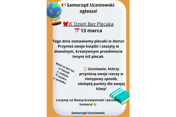 Dnia 13.03.2026 roku Samorząd Uczniowski zaprasza na "Dzień Bez Plecaka"! Szczegóły na plakatach.