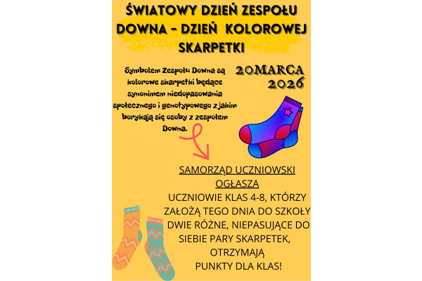 Światowy Dzień Zespołu Downa - Dzień Kolorowej Skarpetki. Informacje na załączonym plakacie.