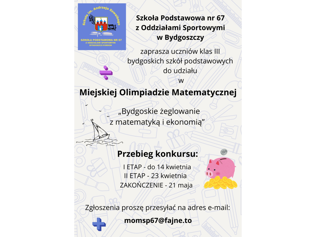 Miejska Olimpiada Matematyczna - konkurs dla klas III. Szczegółowe informacje oraz regulamin znajdują się na plakacie i w załączniku.