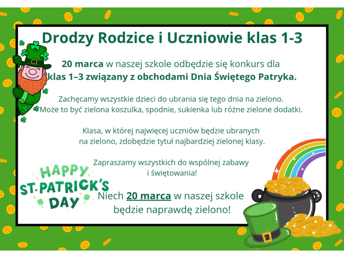 Obchody Dnia Świętego Patryka w naszej szkole - szczegóły na załączonym plakacie.
