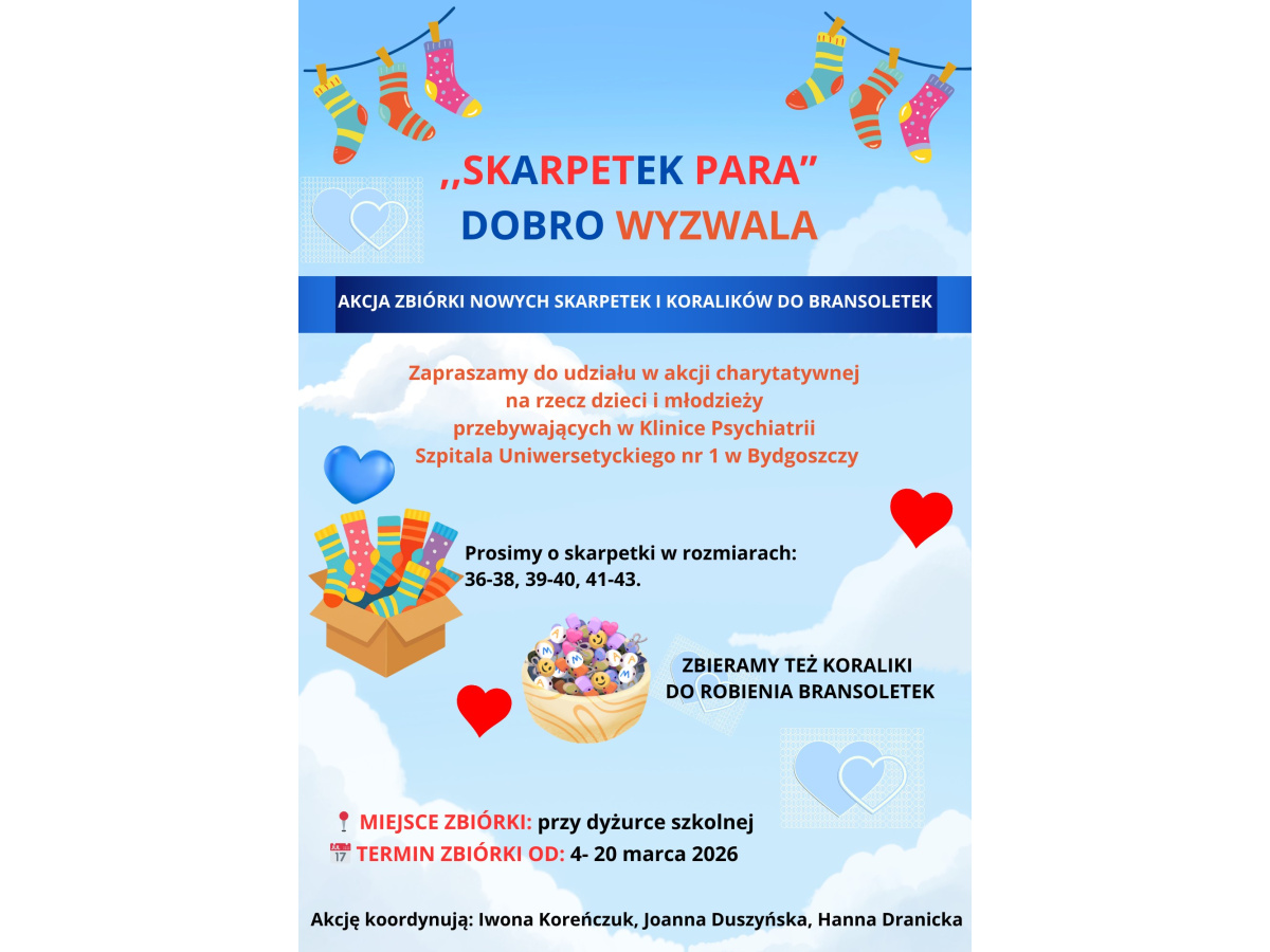 Skarpetek para dobro wyzwala - zapraszamy do akcji charytatywnej. Szczegóły zbiórki znajdują się na załączonym plakacie.