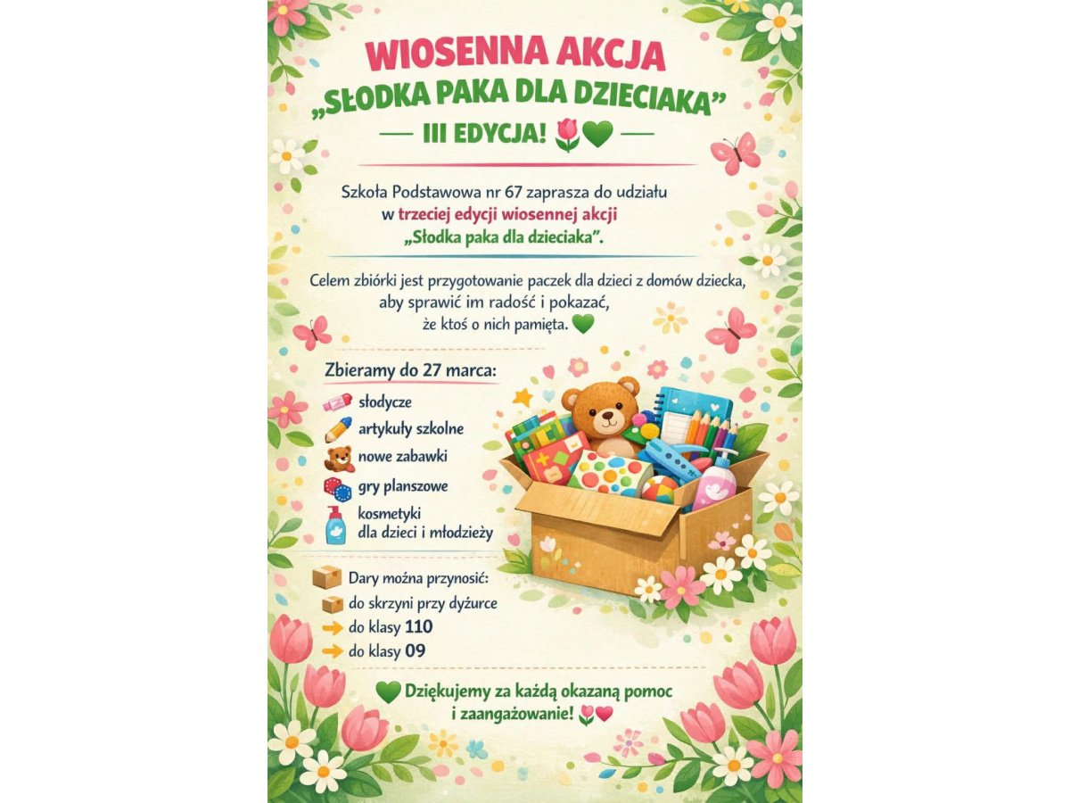 Szkoła Podstawowa nr 67 zaprasza do udziału w trzeciej edycji wiosennej akcji „Słodka paka dla dzieciaka”. Celem zbiórki jest przygotowanie paczek dla dzieci z domów dziecka, aby sprawić im radość i pokazać, że ktoś o nich pamięta.