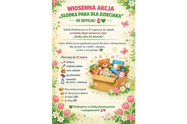 Szkoła Podstawowa nr 67 zaprasza do udziału w trzeciej edycji wiosennej akcji „Słodka paka dla dzieciaka”.
