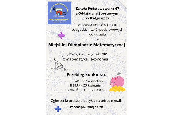 Miejska Olimpiada Matematyczna - konkurs dla klas III. Szczegółowe informacje oraz regulamin znajdują się na plakacie i w załączniku.