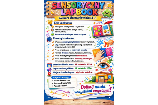 Zapraszamy do udziału w konkursie „Sensoryczny Lapbook”! Uczniowie klas 4–8 mogą wykazać się kreatywnością, tworząc wyjątkowe prace angażujące różne zmysły.