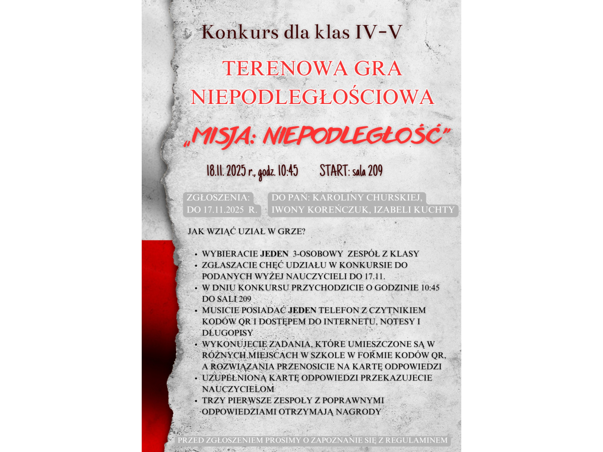 Zapraszamy klasy IV i V do wzięcia udziału w TERENOWEJ GRZE NIEPODLEGŁOŚCIOWEJ „Misja: Niepodległość”. ????????