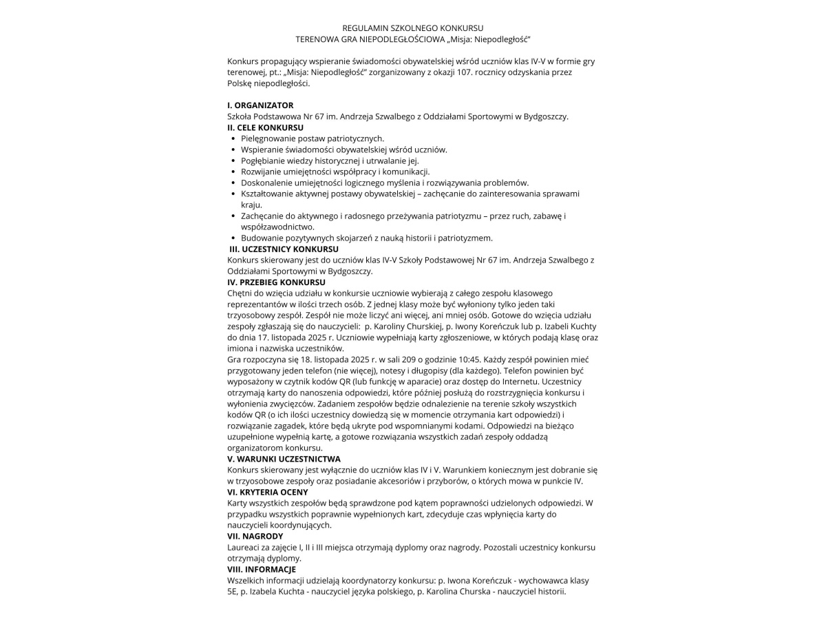 Wystarczy, że pośród uczniów klas IV i V stworzycie zgrane, trzyosobowe zespoły, które wyruszą na poszukiwanie przygód, dzięki którym wypełnicie misję: niepodległość. ????????