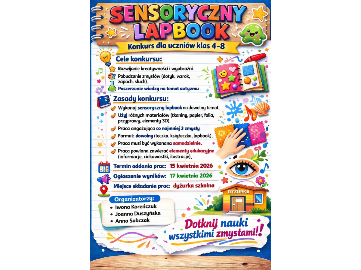 Zapraszamy do udziału w konkursie „Sensoryczny Lapbook”! Uczniowie klas 4–8 mogą wykazać się kreatywnością, tworząc wyjątkowe prace angażujące różne zmysły.